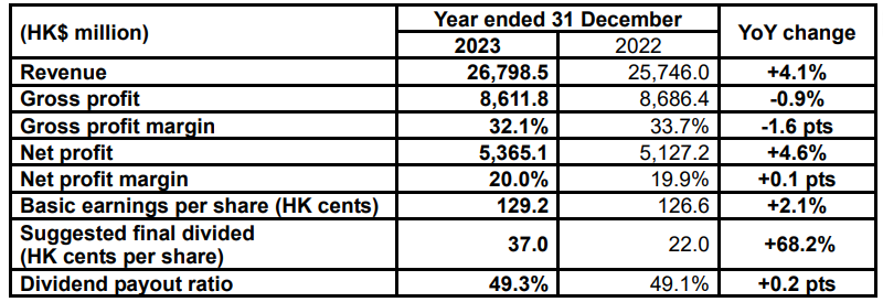 The Group’s financial status remains strong. As at 31 December 2023, it had cash on hand of HK$3,426.6 million (31 December 2022: HK$ 8,167.3 million). Its bank loans reduced by HK$5,342.0 million and net debt gearing ratio fell to 13.3%. The Board of Directors has recommended payment of a final dividend of HK37.0 cents per share and, together with an interim dividend of HK26.0 cents already paid, total dividend for the year is 63.0HK cents, representing a dividend payout ratio of 49.3%.